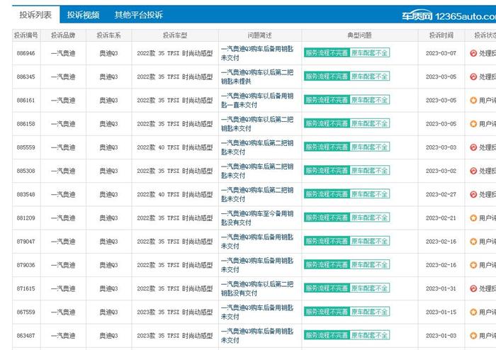 去年12月购买奥迪Q3 第二把钥匙至今未交付