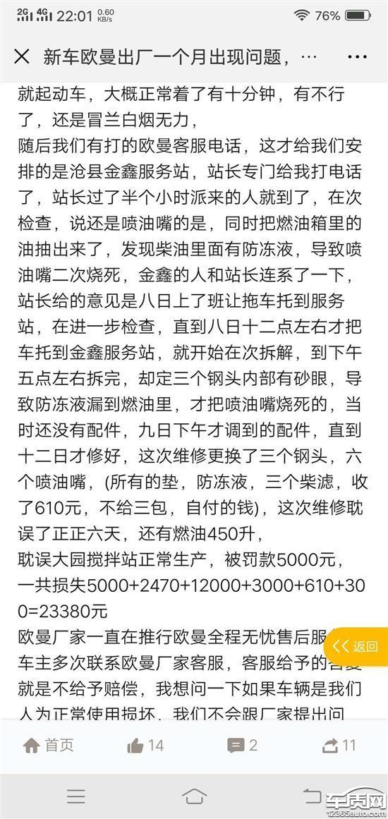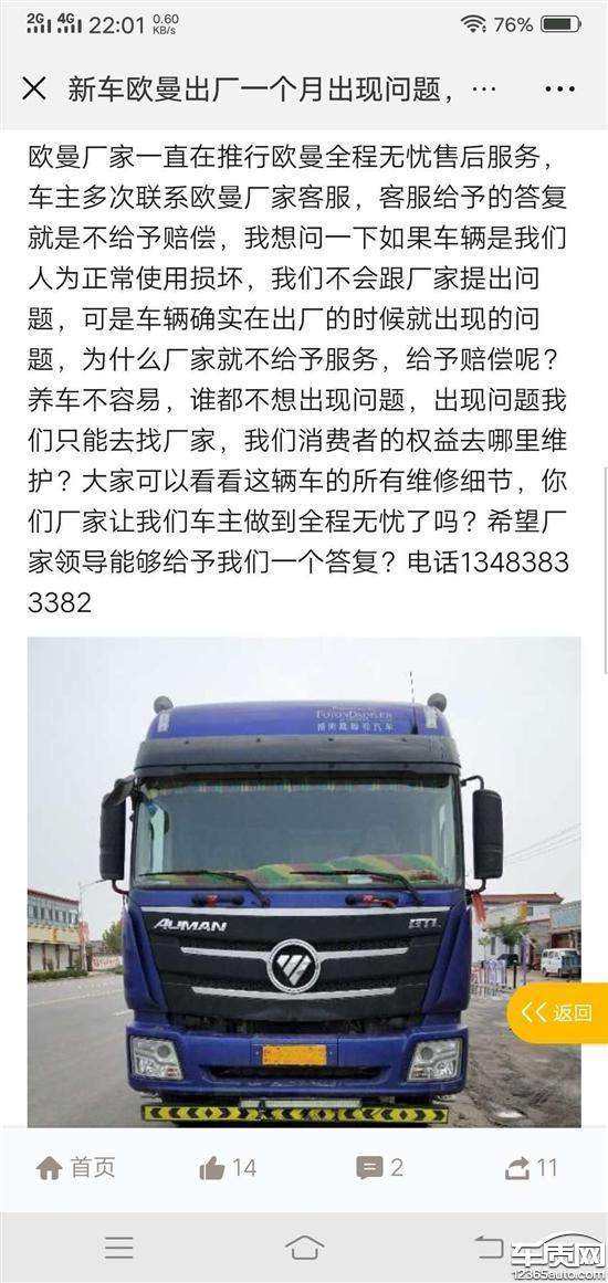 欧曼车辆出现质量问题 售后没有保障